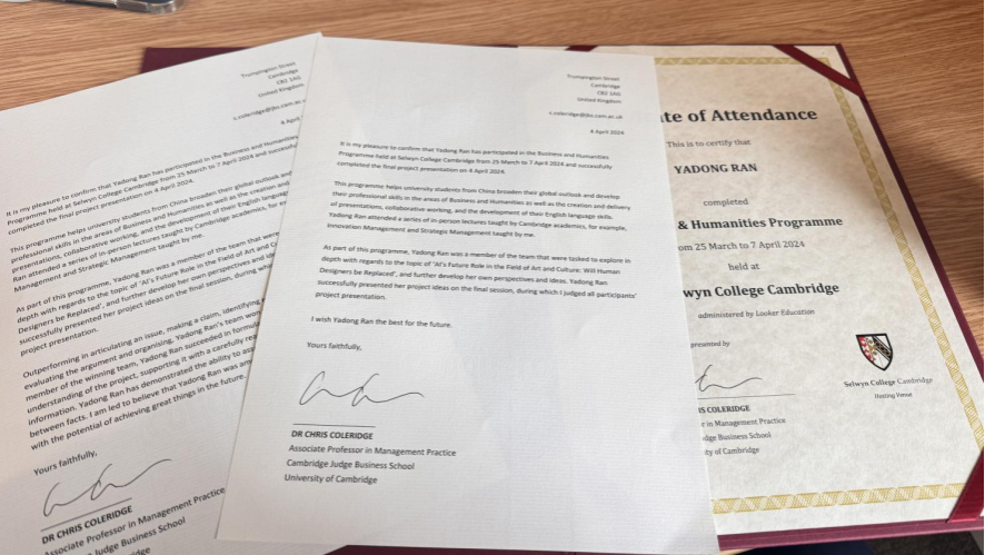 2024年3月 ,冉亚冬有了一个机会,去世界名校—剑桥大学研学,也正是这次研学,让她真切体会到了世界文化的多样性。在研学期间,她聆听了剑桥大学克里斯·柯勒律治教授的创新管理课程,还有帕特里克·霍斯利教授的英国教育系统与大学课程。也让她看到了一个不一样的大学课堂,开放式的课堂氛围,教授幽默的授课方式,世界创新的趋势,让她受益匪浅。上课之余,她还参加了学校的正式晚宴,浏览了剑桥的古老建筑和博物馆,深刻感受到了英国浓厚的文化氛围,体会到了文化差异带来的碰撞与融合。“体验传统文化的同时,英语的交流也是我需要跨越的一道心理防线,如何用英语更大胆的展示自己,是机会,更是挑战。”冉亚冬并没有“怯场”,她不断的跟身边的英国同学请教口语,也勇于在课堂发表自己的观点。用她的话说,既然来研学,就要有所获,有所得。