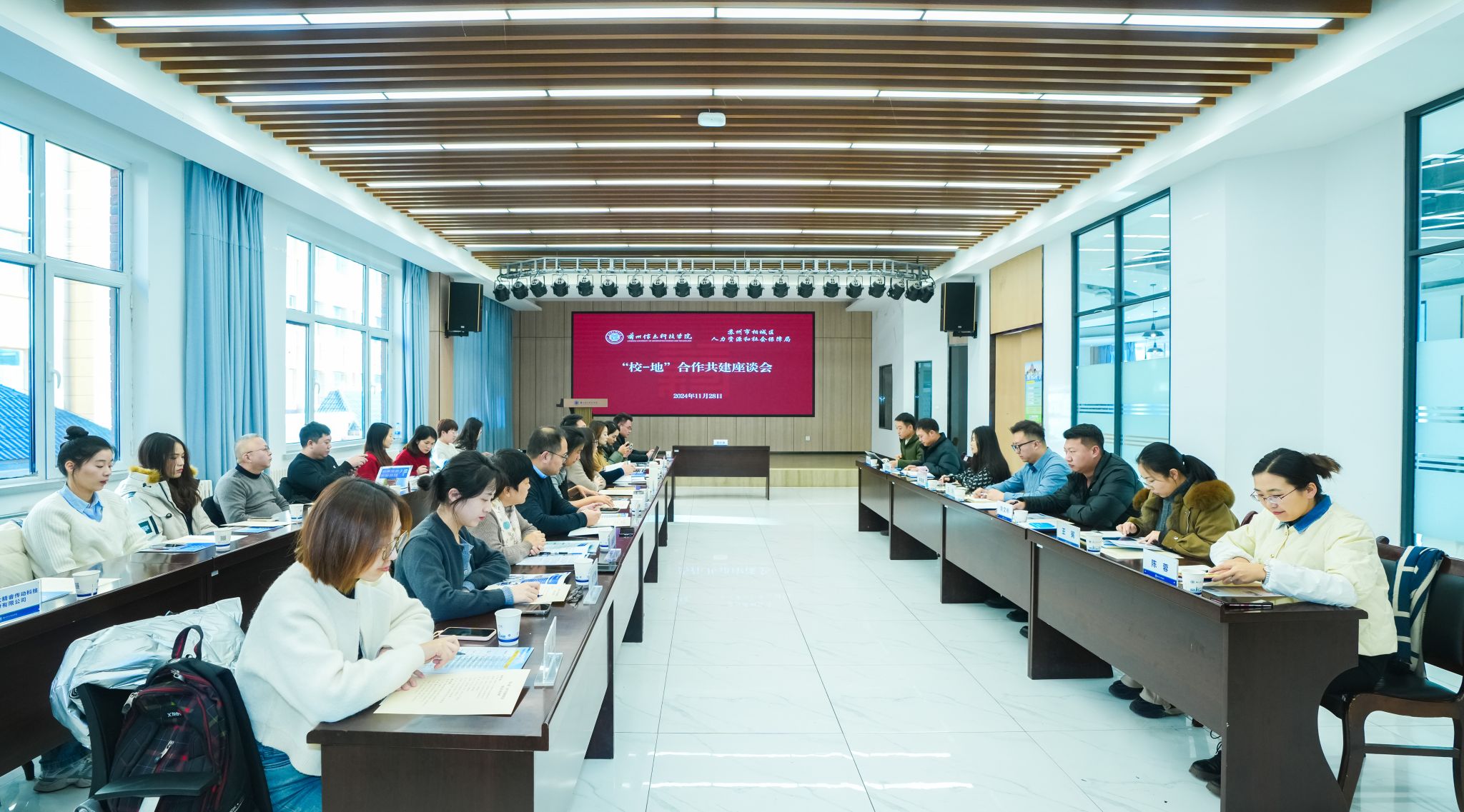 座谈会上,就业服务中心介绍了学校的基本情况,包括教育理念、专业设置以及学生培养情况。苏州市相城区人力资源和社会保障局副局长俞婷详细介绍了相城区的发展状况及对人才的需求,强调了区人社局在促进地区就业、服务企业和推动社会经济发展中的积极作用。