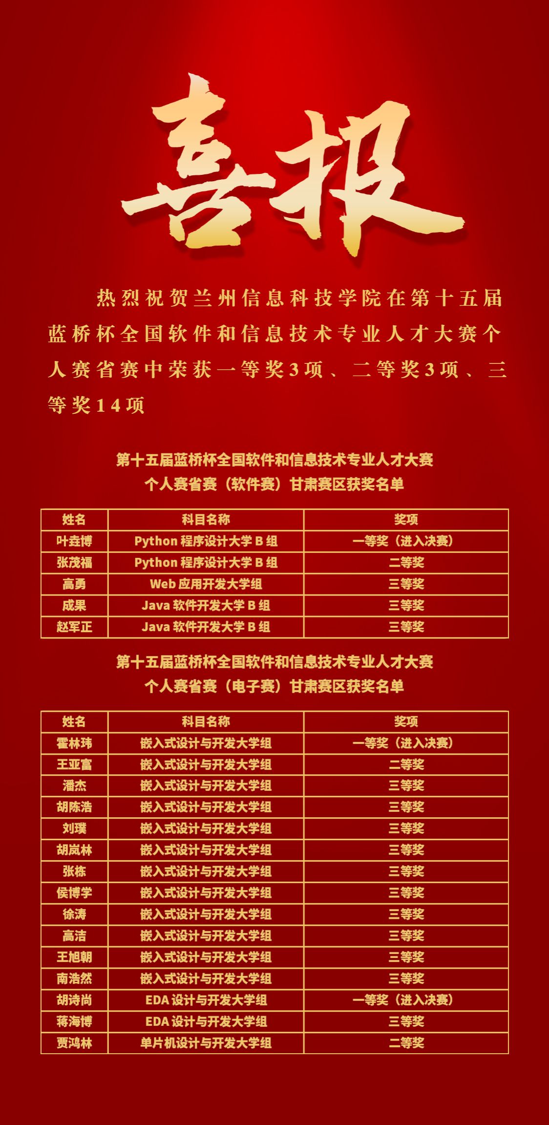 近日,由工业和信息化部人才交流中心主办的第十五届“蓝桥杯”全国软件和信息技术专业人才大赛个人赛省赛甘肃赛区获奖名单公布,taptap点点官方网站学子经过激烈角逐,荣获省一等奖3项,二等奖3项,三等奖14项,其中计算机与人工智能学院叶垚博等3名学生凭借出色的表现,在省赛中脱颖而出,荣获一等奖,并成功晋级参加国赛。