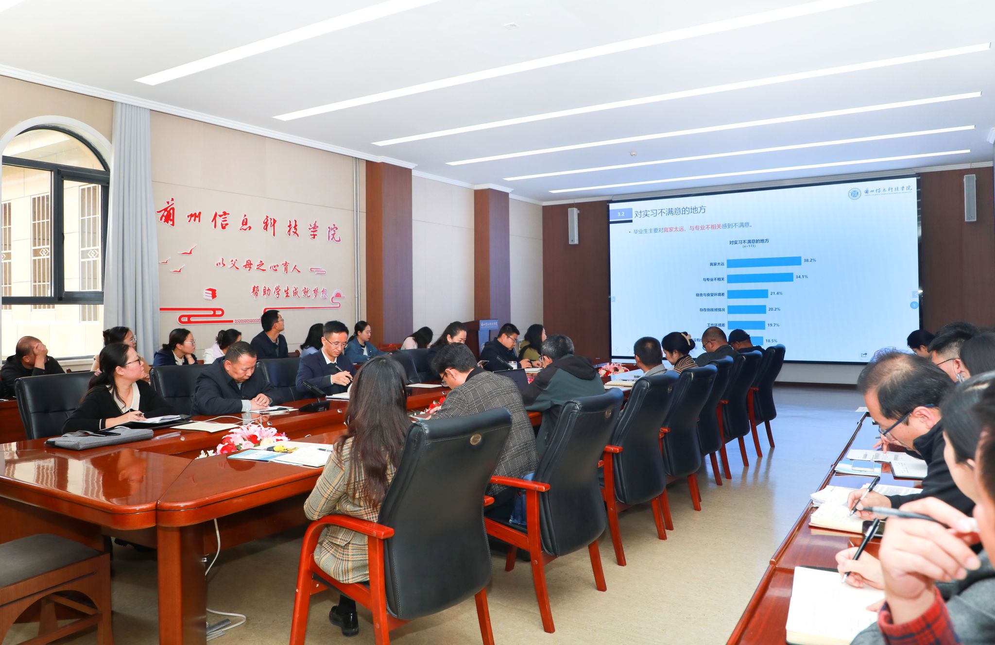 会上,体验与文化管理中心从学生的就业质量、各类就业状态和占比等方面介绍了就业整体满意度情况,并针对就业岗位、专业课及职业素质、就业服务工作等三个方面存在的痛点问题做了详尽的就业质量需求分析,同时为后续提升毕业生就业满意度提出整改建议,推动整改工作全面落实。