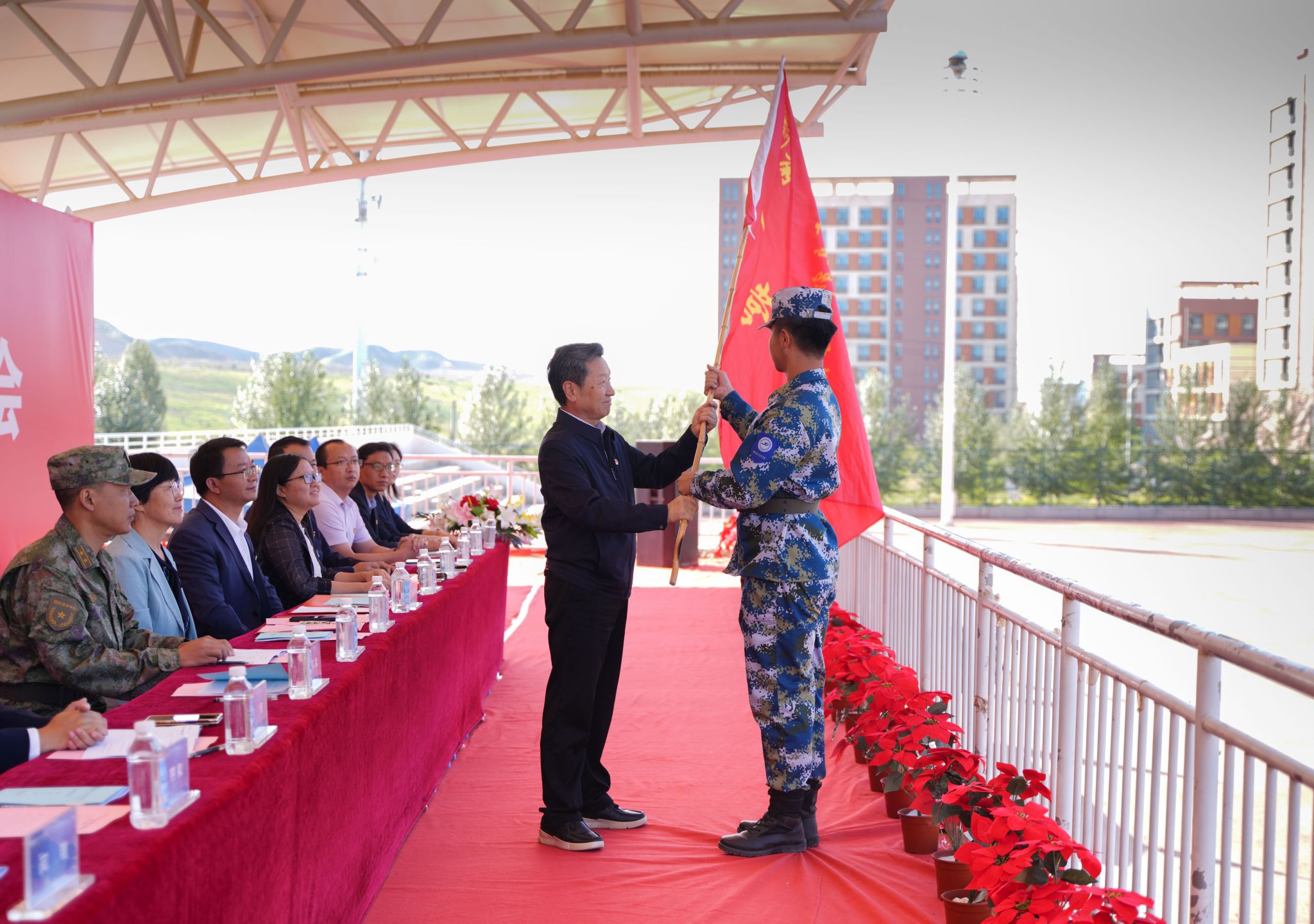 伴随着嘹亮的国歌声,五星红旗徐徐升起。校长助理殷学丽宣读《关于成立taptap点点官方网站2023年学生军训工作领导小组及训练方队的通知》,党委副书记、副校长郭筱磊宣读《关于成立taptap点点官方网站2023年学生军训临时党支部的通知》,党委书记周怀春向军训方队代表授队旗。
