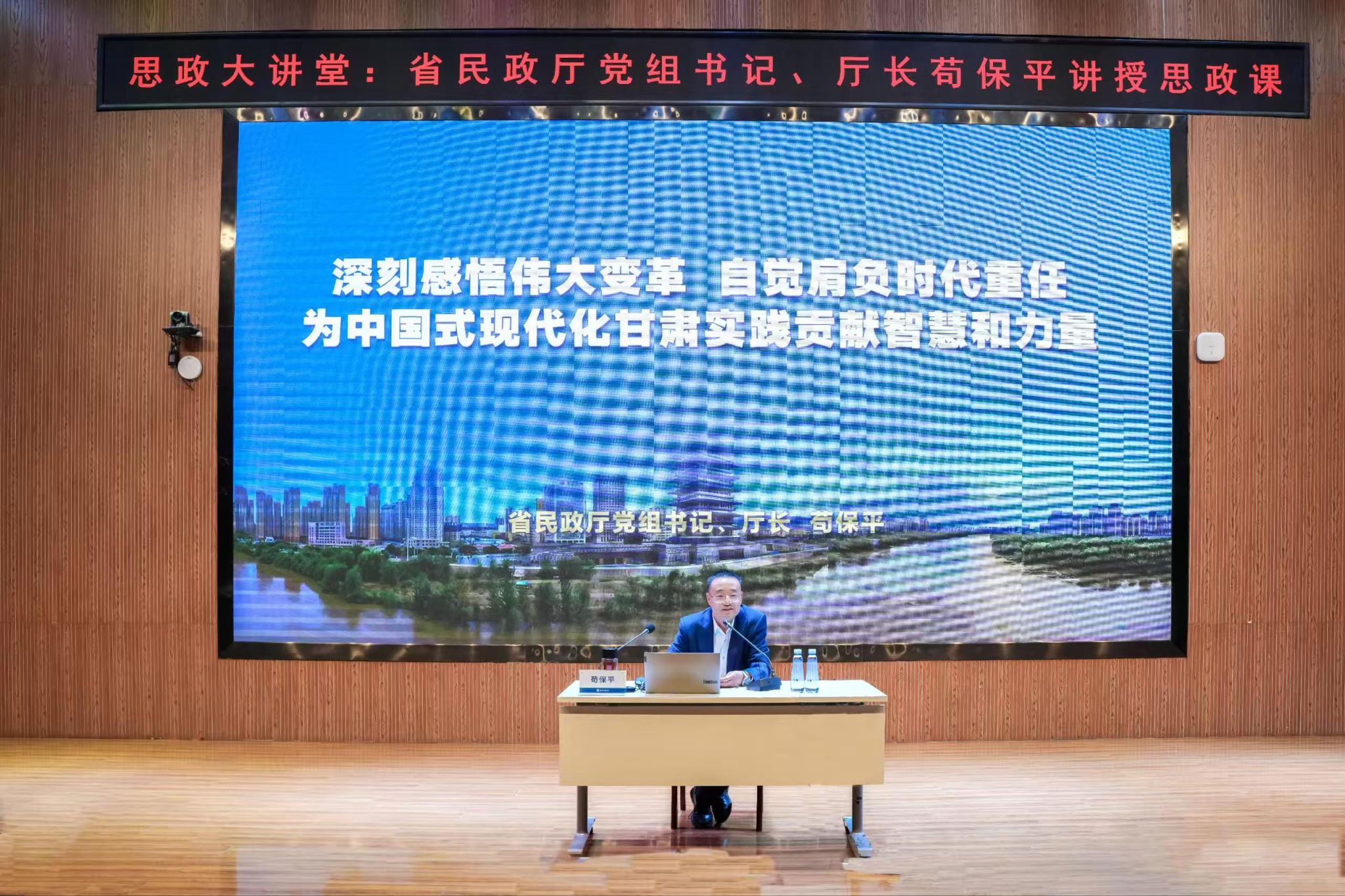 苟保平围绕“深刻感悟伟大变革 自觉肩负时代重任,为中国式现代化甘肃实践贡献智慧和力量”这一主题,结合当前的形势和任务,通过举事例、找规律、探成因,使讲思政课不停留在“是什么”而是回答“为什么”;注重揭示创新理论、实践成果、政策文件背后的思想力量和精神力量,既从宏观层面回顾了新时代的伟大变革,帮助师生深刻认识到中国式现代化的光明前景;又鼓励广大师生深刻把握中国式现代化甘肃实践的丰富内涵与战略定位,充分认识甘肃现代化建设蕴含的巨大机遇与发展潜力,在踊跃投身陇原振兴发展的火热实践中激发奋斗之志,锐意创新进取;同时结合甘肃民政工作实际,生动解读了新时代民政工作职责使命,让师生真切感受到民政工作与民生福祉、社会发展的紧密联系,对青年一代如何肩负时代重任、服务奉献社会也有了更清晰的方向。他寄语广大青年,要在努力练好人生和事业基本功中增长智慧才干、淬炼担当之能;在传承弘扬民政文化丰富内涵中厚植为民之情、践行爱民初心。努力成长为有理想、敢担当、能吃苦、肯奋斗的新时代好青年,为加快建设幸福美好新甘肃、不断开创富民兴陇新局面,奋力谱写中国式现代化甘肃篇章贡献自己的智慧和力量!