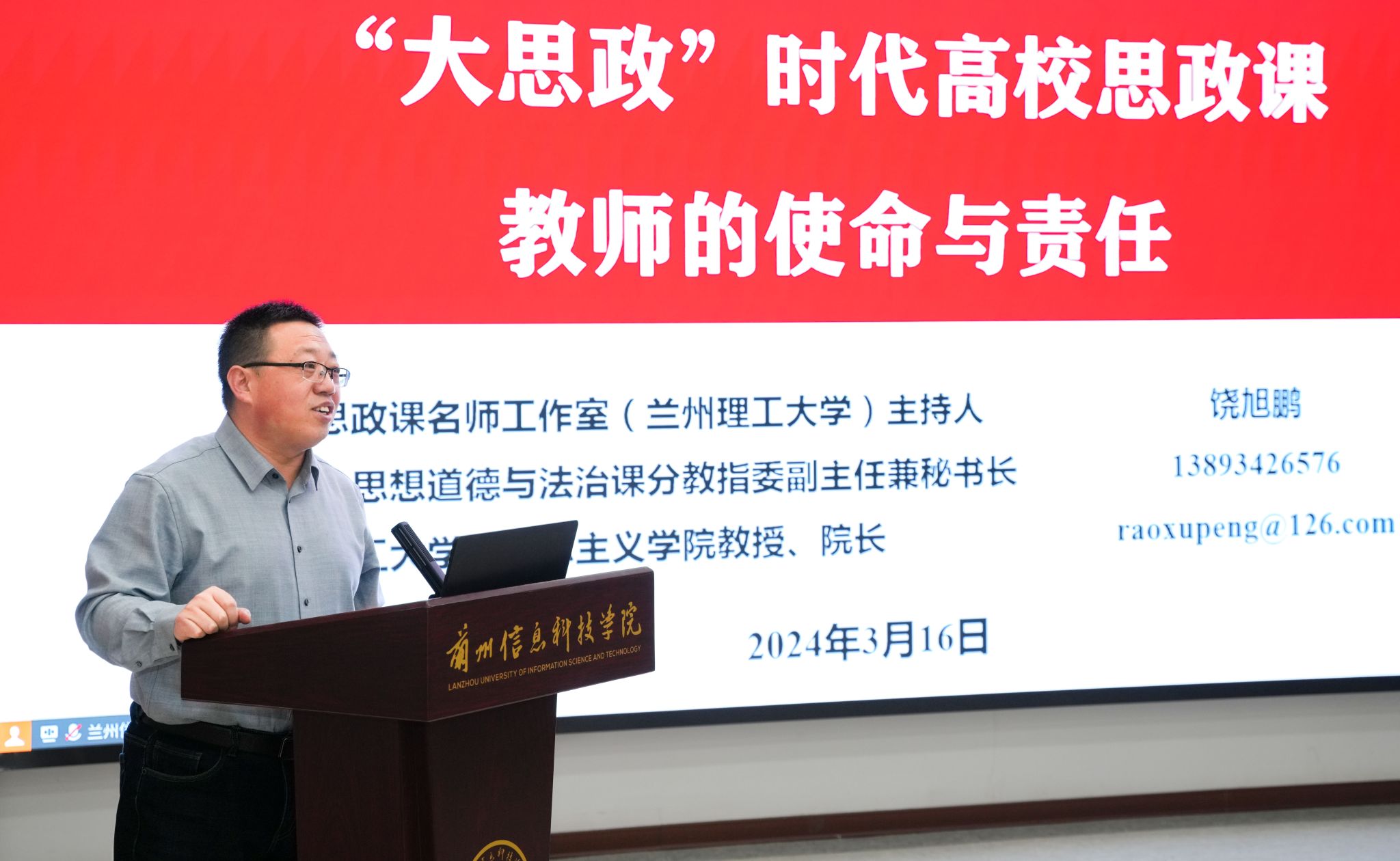 会议邀请省级重点马院兰州理工大学马克思主义学院院长饶旭鹏教授作了题为《大思政时代高校思政课教师的使命与责任》的主旨报告。饶旭鹏教授从“思政课的总体定位与目标、大思政课建设的基本遵循、新时代思政课实践基础新变化、新时代思政课建设的基本遵循、办好思政课关键在教师”等五个方面阐述了“大思政”背景下开展高校思政课改革创新的目标、环境、要求,指出了思政课、思政课教师队伍建设的重要发力点和重要策略等。主旨报告对于全体教师进一步树立“大思政课”意识,提高思政课教学质量具有重要指导意义。