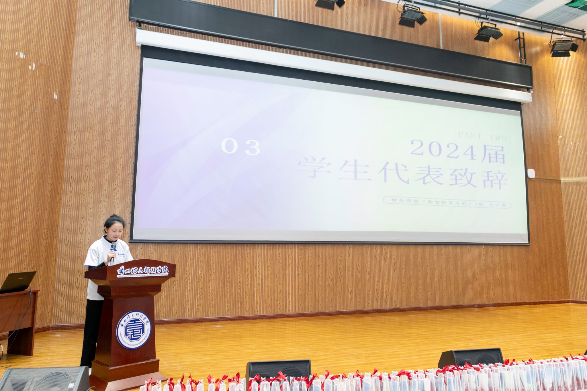 2024级财务管理专业(数智财务方向)新生代表马玉琪同学分享了她对未来学习的期待和对进入金蝶数智财务产业学院的自豪感。她表示,将珍惜在学院学习的每一刻,奋力前行,不负韶华,立志成为一名优秀的财务专业人才。