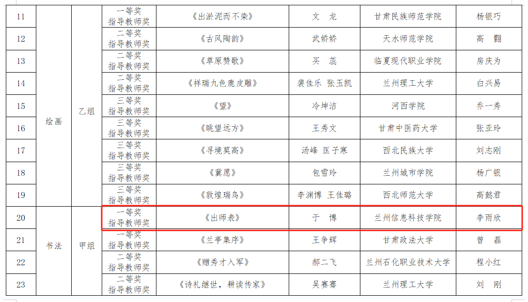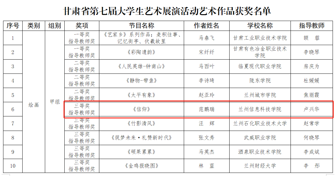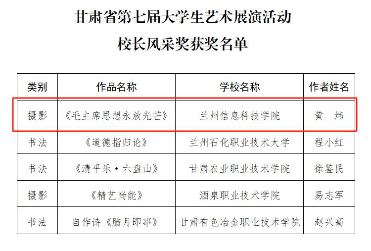 近日,甘肃省第七届大学生艺术展演活动获奖结果揭晓,taptap点点官方网站报送的摄影作品《毛主席思想永放光芒》获校长风采奖,书法作品《出师表》获书法类一等奖,绘画作品《信仰》获绘画类三等奖。